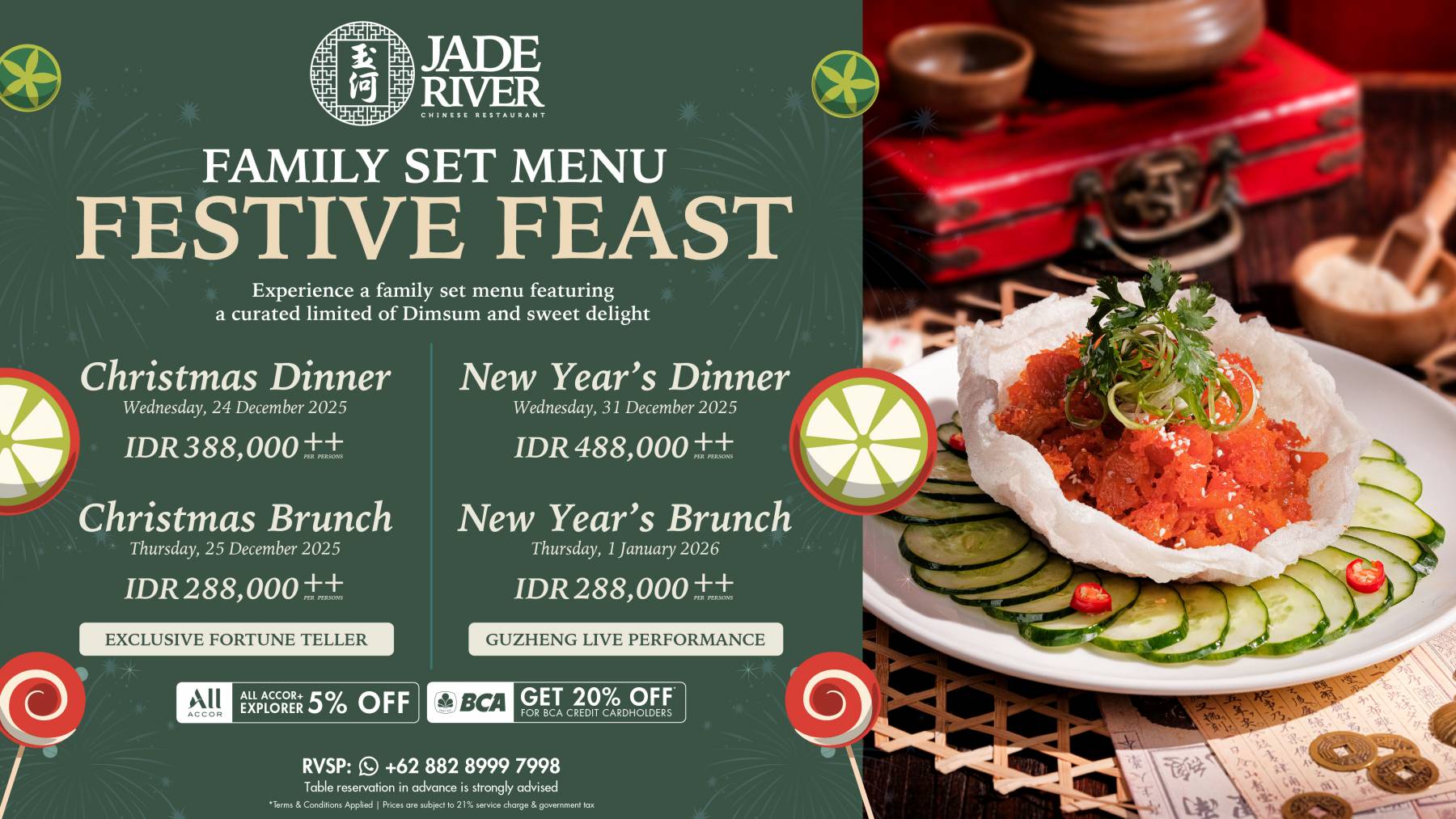 Musim perayaan membuka ruang untuk refleksi dan kegembiraan bersama. Jade River menyambut momen ini dengan Festive Feast Family Set Menu, sebuah perjalanan bersantap yang dikurasi dengan memadukan cita rasa Tiongkok yang abadi dengan komposisi yang progresif. Setiap hidangan diracik untuk membawa makna: tekstur yang membangkitkan rasa nyaman, aroma yang membangkitkan kenangan, dan cita rasa yang mengundang percakapan untuk terjalin secara alami.