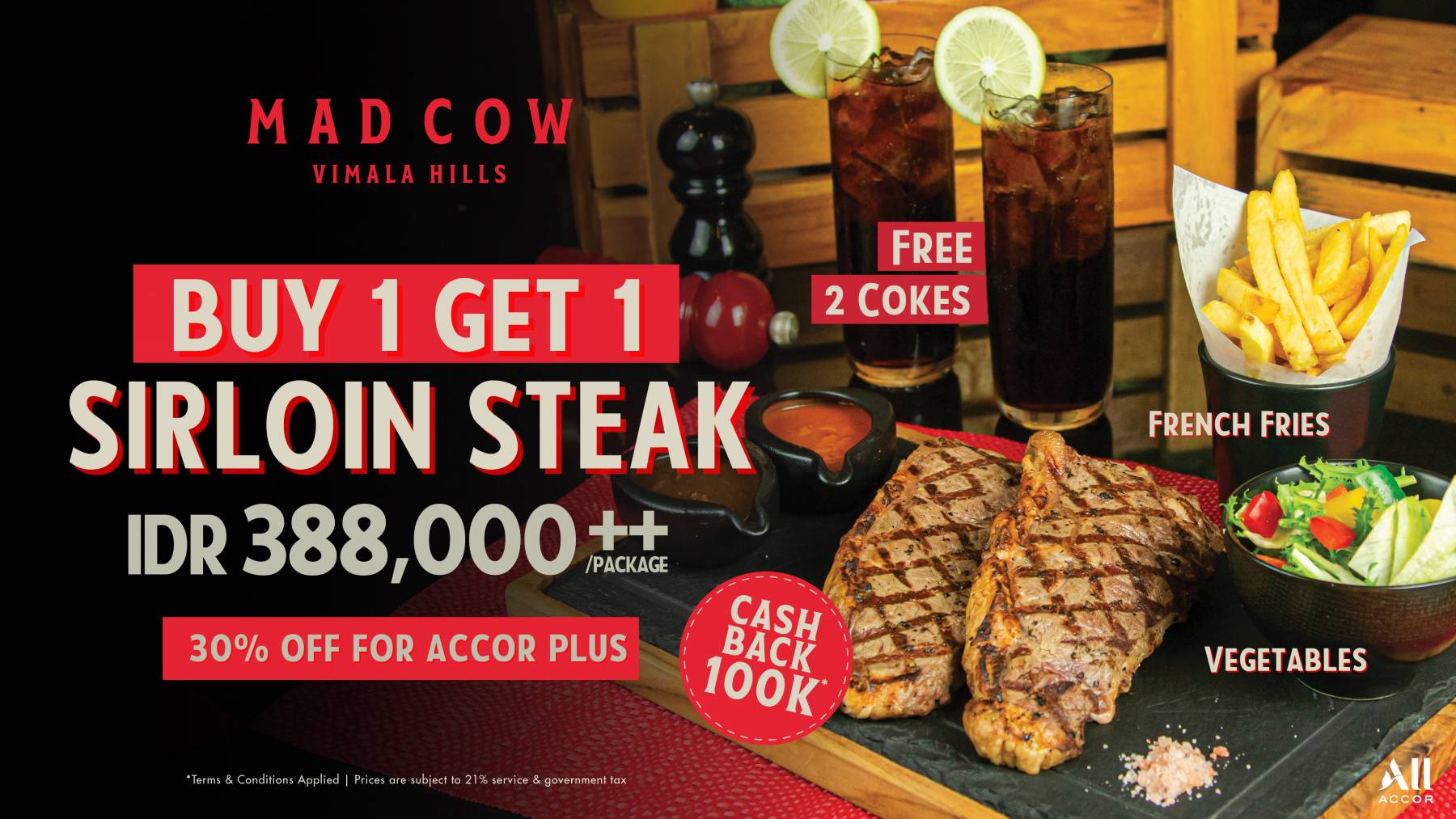 Sirloin di Mad Cow mengusung unsur-unsur utama: rasa pedas, bumbu, dan karakter alami potongannya. Penawaran Beli 1 Gratis 1 ini menciptakan suasana yang akrab, dua piring disajikan berdampingan, ditemani kentang goreng, sayuran, dan dua cola yang menyegarkan.