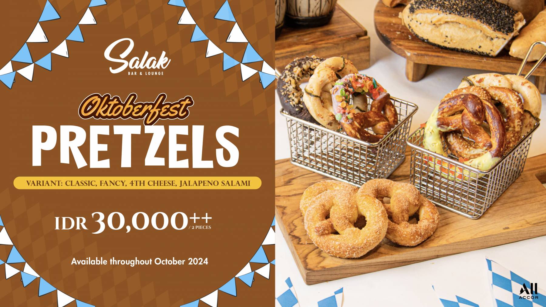 Ketika berbicara tentang Oktoberfest, pretzel bukan sekadar camilan – mereka adalah tradisi. Di Salak Bar & Lounge, Anda dapat menikmati pretzel hangat dan kenyal yang sempurna menggabungkan krenyes di luar dan lembut di dalam. Disajikan dalam variasi kreatif, pretzel ini bukan hanya kenikmatan bagi lidah Anda tetapi juga cara seru untuk merasakan cita rasa Bavaria.