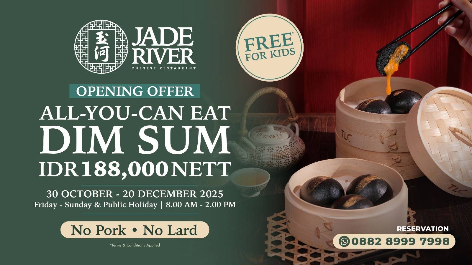 Celebrate the grand opening of Jade River Chinese Restaurant with our All-You-Can-Eat Dim Sum special at IDR 188,000 nett per person.
