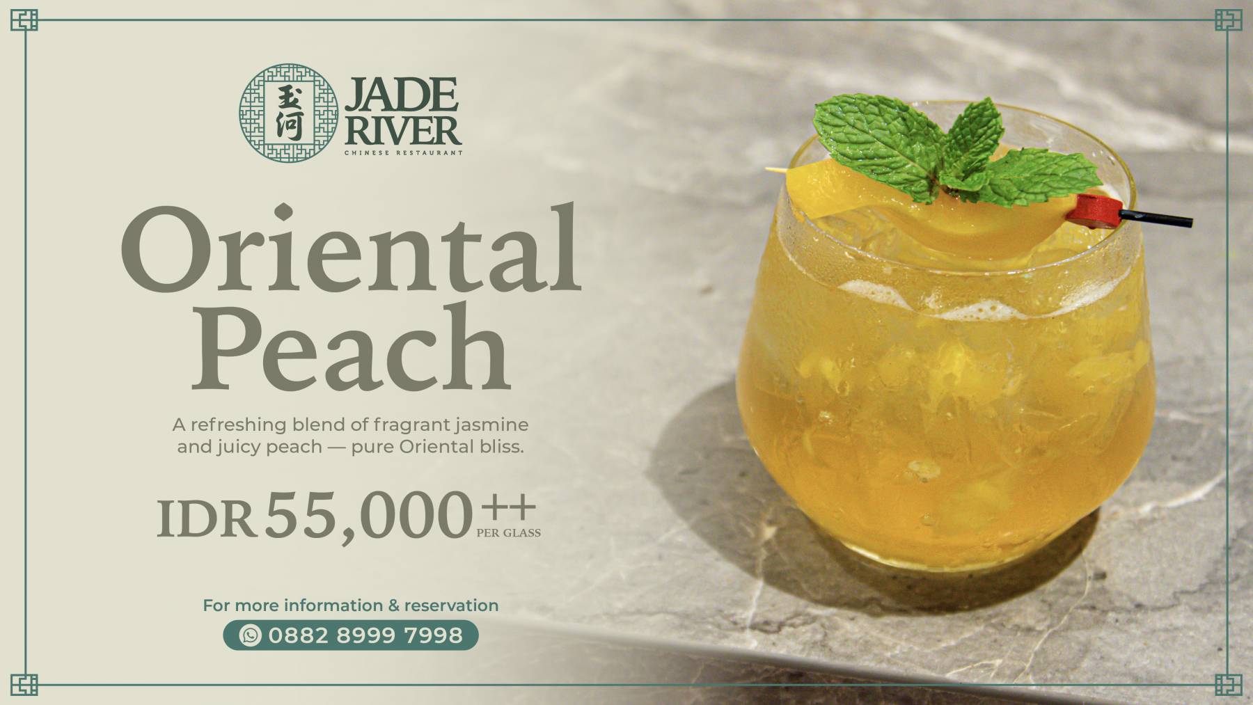 Refresh your day with Oriental Peach, a delightful fusion of fragrant jasmine and juicy peach that captures the essence of Oriental bliss. Perfectly balanced between floral notes and fruity sweetness, this refreshing drink is the ideal companion for your dining experience at Jade River.