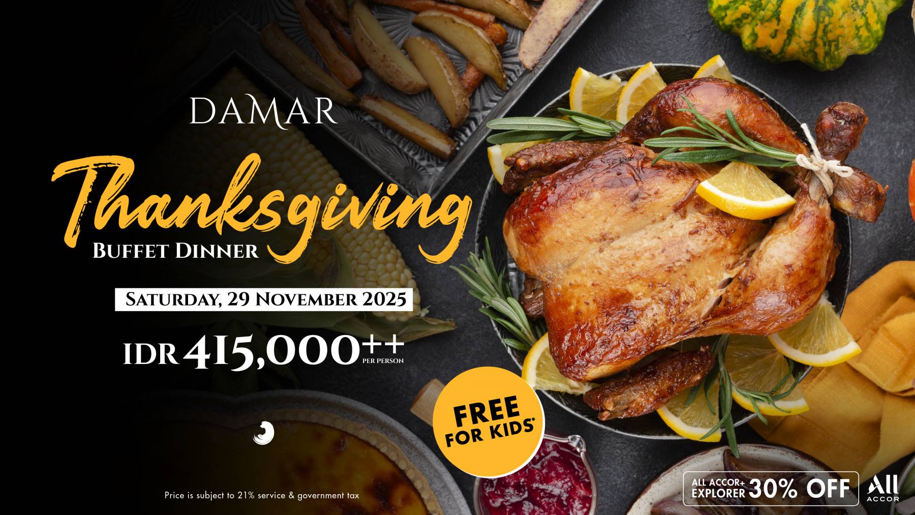 Celebrate gratitude and togetherness this Thanksgiving at Damar Restaurant. Delight in a festive buffet featuring a lavish spread of classic Thanksgiving favorites — from perfectly roasted turkey and hearty sides to irresistible desserts.