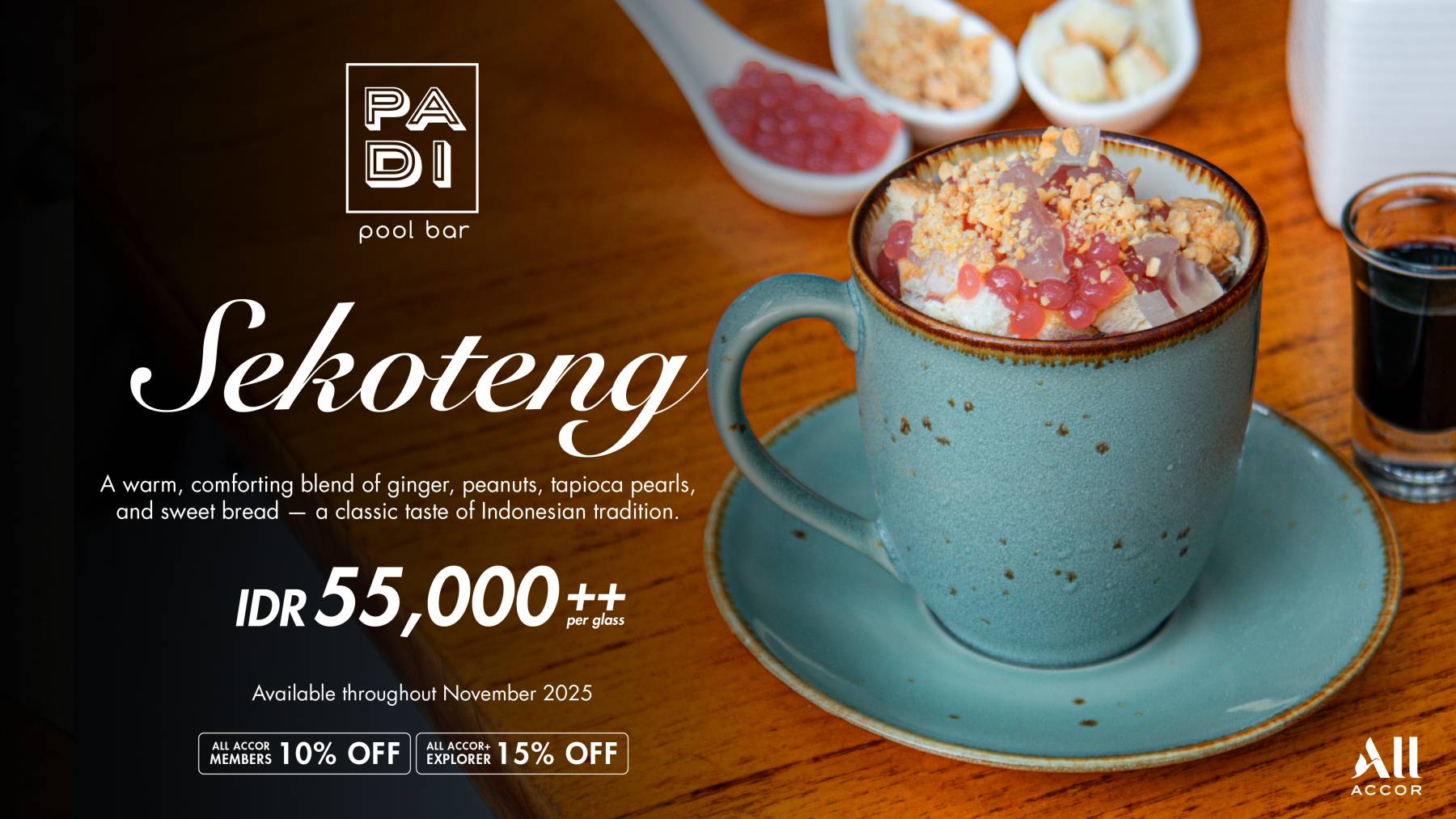 Warm up your day with a comforting cup of Sekoteng, a delightful Indonesian classic made from ginger, peanuts, tapioca pearls, and sweet bread. This heartwarming blend brings together the perfect balance of sweetness and spice — a nostalgic treat to soothe your soul.